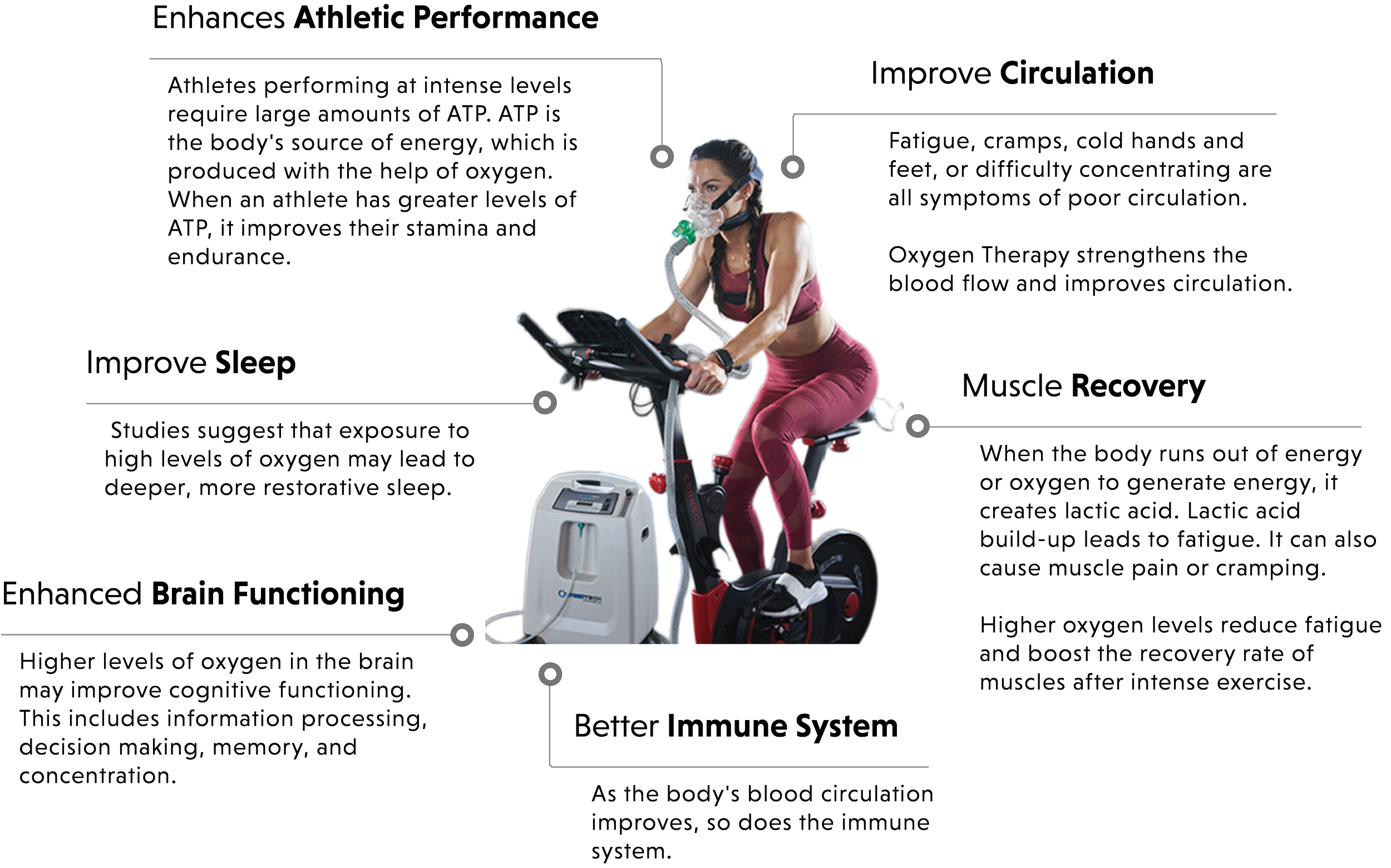 Breathing oxygen while riding a standing bike keeps the heart rate mildly elevated. This is great for muscle recovery and performance.